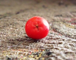 My latest explorations into the Rowan tree have been making rowan berry hoops by threading fresh berries onto copper wire, and making rowan berry and apple jelly, using local fruit – it turned out the most glorious rich pink colour!