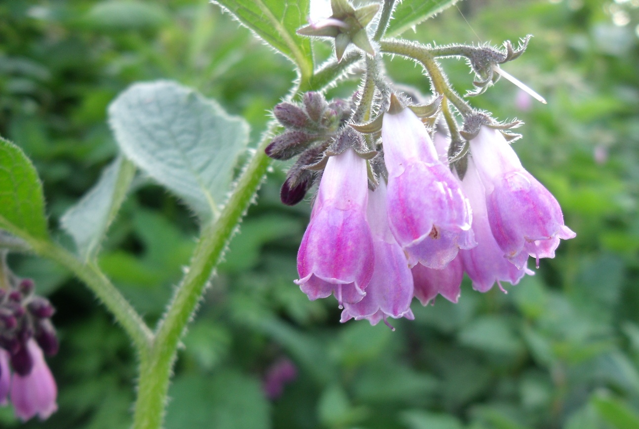 As another member of the boraginaceae family, Comfrey shares some of the characteristics of this plant family – the hairy leaves and stem, basic leaf shape and configuration of leaves bear a resemblance to that of Borage, covered in the last post. Comfrey grows easily in most temperate countries of the world, including North America, Europe, western Asia and Australia. The plant prefers to grow in damp, marshy soil, and can easily grow as a garden plant. I have one in a tub, and a rather pretty plant it is as well, though requiring a lot of water – in a warm, dry spell, the Comfrey and Valerian are always the two plants that keel over first! The flowers are small and bell shaped, usually white or pink in colour, and a marvel of delicate beauty when observed closely, resembling stained glass in direct sunlight, at which time they are heavily frequented by the bees. The plant grows up to 1 metre in height, in clumps, favouring wild land as well as thriving in gardens. We have quite a bit growing locally that has self seeded in the public green lands.