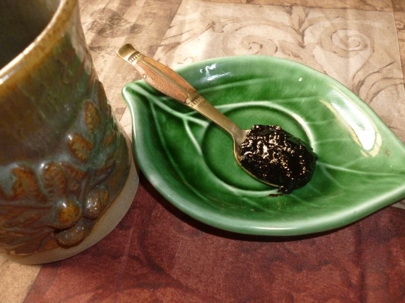 The juice and fruit once pushed through the sieve can go back into a pan on a moderate heat. Simmer it gently until it has reduced by at least 50% – which won’t take as long as you think, honest! Set aside two generous scoops of this gloopy mixture. To the rest, add 3/4 of a jar of honey and stir thoroughly until the juice and fruit pulp is well mixed in. Pour it back into a clean jar and put the lid on. This should set into a lovely thick, jelly like consistency, which is delicious either as a teaspoon dose of immune boosting delight, or stirred into puddings, spooned onto porridge, or even mixed into a cup of hot water as a hot drink! No added sugar – just the natural fruit sugars, and the honey itself. By simmering it and reducing it down, you are removing a large amount of the water in the fruit, which means it should keep well for a good while as the honey is much less diluted, but if you are worried, store it in the fridge once it has been opened.