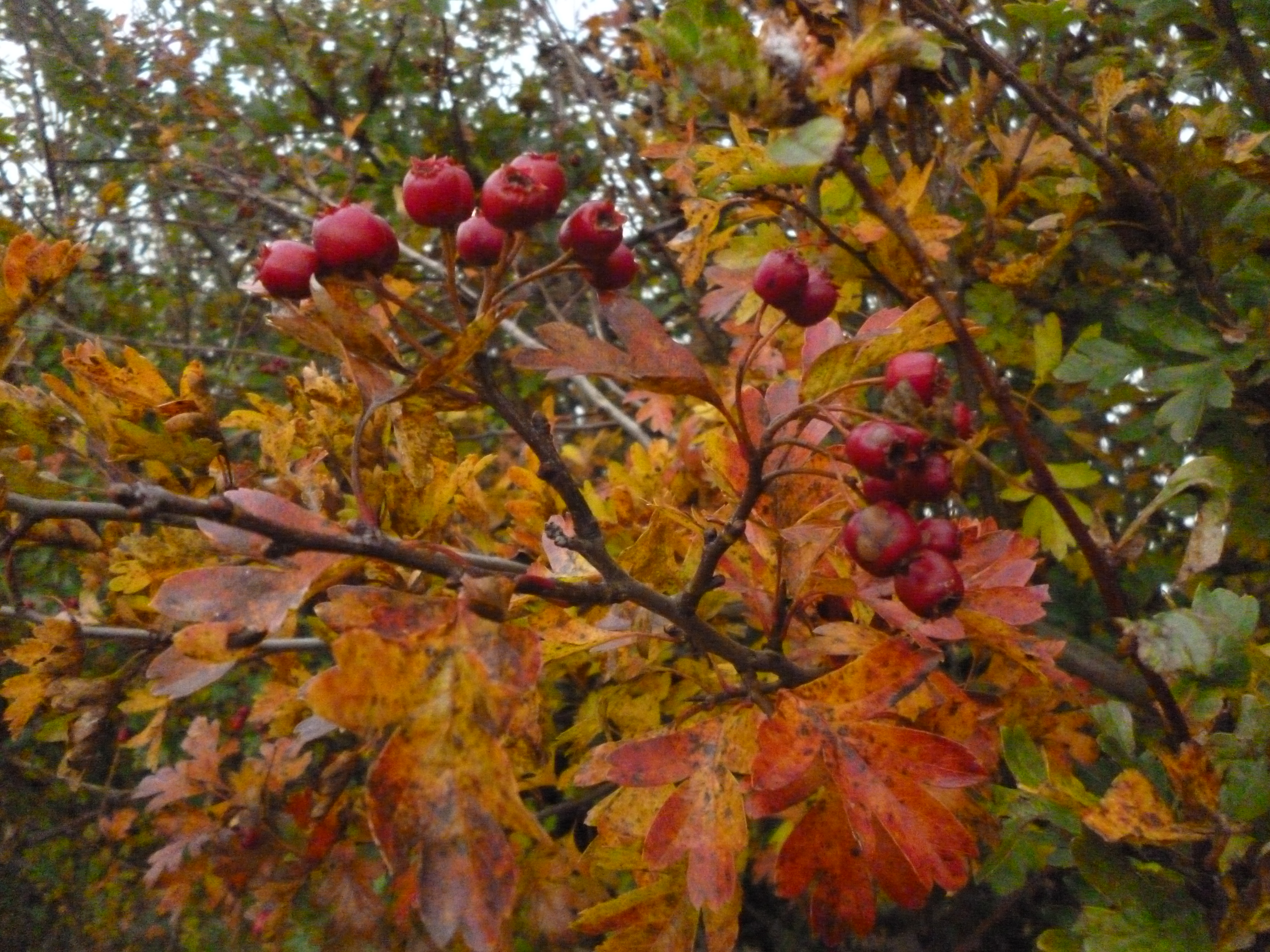 Head down and slogging up the opposite slope, the hedgerows are filled with fire and blood as the hawthorn berries cluster thickly. It has been a good year again for them this year, and I’ve made a mental note to go back for a load soon for ketchup. The leaves are turning rich, vivid shades of red, gold and copper, striking against the berries, though they too are beginning to fall.